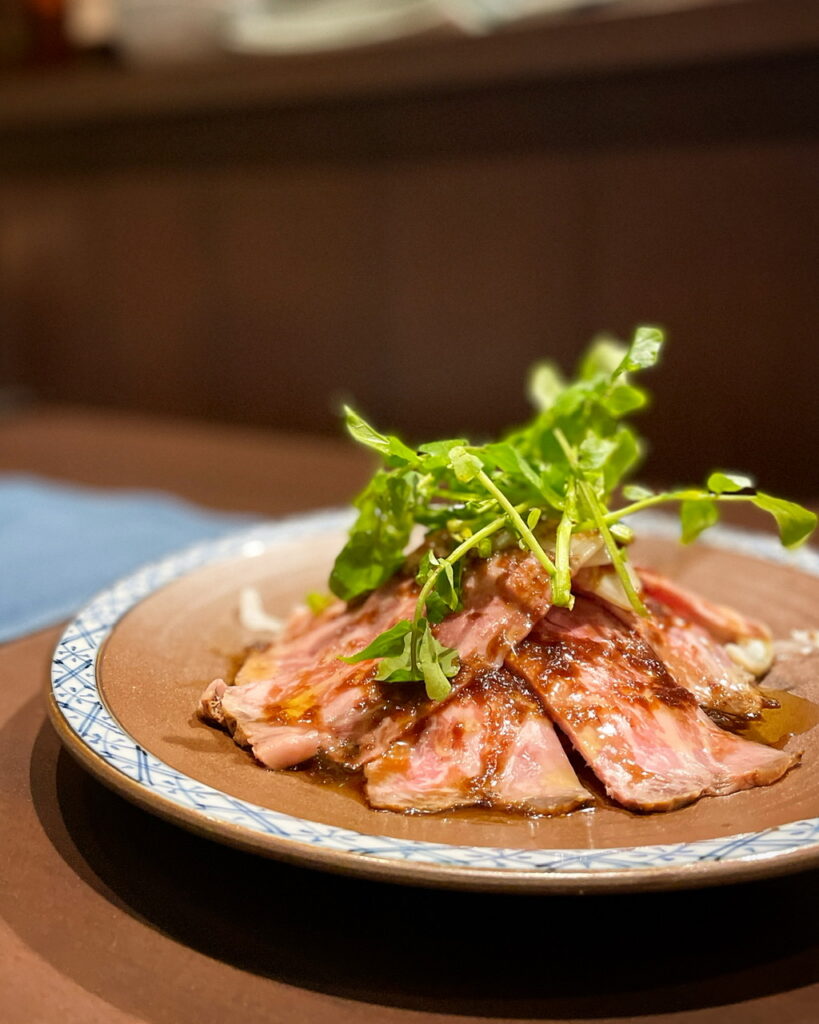 水でさらしたオニオンスライスの上に盛り付け洋食手嶋さんの特製ローストビーフソースとクレソン、軽くオリーブオイルで仕上げました。