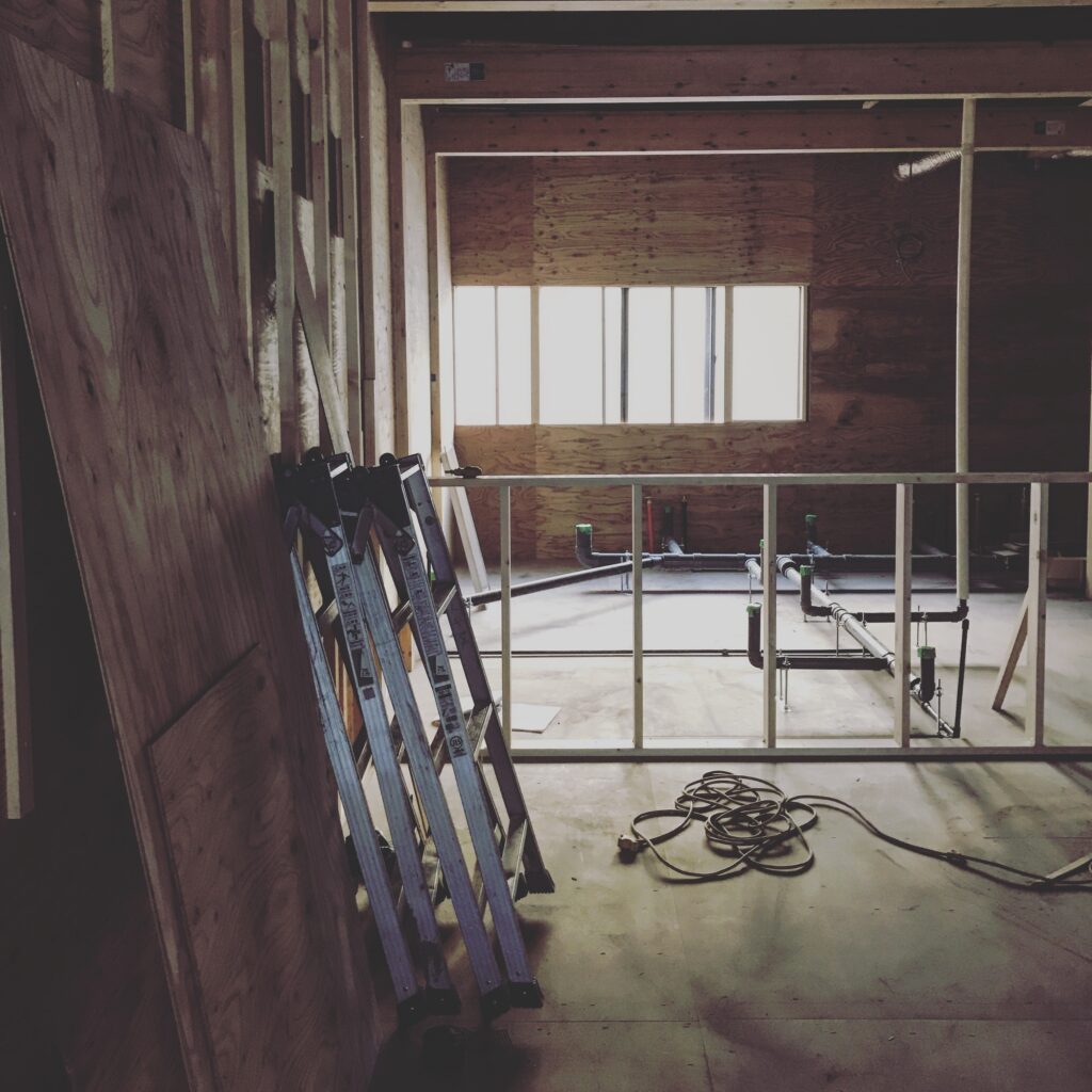皆さんがそれぞれの持ち場で工事を進めていきます。プロ中のプロが集まり自分の店を作って下さる光景は何とも言えないものです。昨日までは何もなかった四角い箱が多くの職人さんで賑わい、木材や機材、配管などが持ち込まれまさに命を得たという印象です。